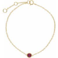 About This ItemA single round cut ruby, set in a Milgrain decorated bezel, set on a gorgeous 9ct yellow chain. Bracelet measures 19cm in length and secures with a bolt ring clasp.Gemstone InformationRuby gets its name from the Latin word 'rubers', which simply translates to the word 'red'.Ruby jewellery makes a perfect gift for both those with a July birthstone, and those celebrating a 15th, 40th ad 80th anniversary.Ruby was believed by the Kahn cultures to protect the in battle.Jewellery CollectionGemondo's Classic Style Collection emulates timeless styles using jewellery making techniques perfected for the modern day. Add an touch of colour and sparkle to a special occasion, or just an elegant yet subtle piece for everyday wear. Product Code 135L0288019 Dimensions Width - 4mmHeight - 4mm Material 375 9ct Yellow Gold Gemstone Details 1 x Ruby - 0.34ct - Round Cut - 4mm Gemstone Country of Origin Myanmar - Manufacturers part number: Gemondo_135L0288019