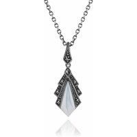 Crafted from sterling silver, this Art Deco inspired necklace features a mother of pearl gemstone decorated with a fan of sparkling marcasite gemstones. This elegant white mother of pearl necklace design channels Art Deco inspirations through its sparkling embellishments and geometric lines.Mother of Pearl Information: Number of Stones: 1 Stone Shape: Stone Size: 8mm x 5mm Carat Weight: 1ct Natural/Created: Natural Mother of Pearl Country of Origin: Australia marcasite Information: Number of Stones: 8 Stone Shape: Round Stone Size: 1 x (1.30mm) | 1 x (1.20mm) | 6 x (0.90mm) Carat Weight: 0.07ct Natural/Created: Natural marcasite Country of Origin: Austria