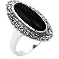 A stunning Art Deco style ring crafted from sterling silver set with a shell mother of pearl cabochon gemstone, offset with sparkling marcasite gemstones.Black Onyx Information: Number of Stones: 1 Stone Shape: Oval Stone Size: 1.30-1.60mm Carat Weight: 1.30ct Marcasite Information: Number of Stones: 14 Stone Shape: Round Carat Weight: 0.23ct