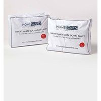 To keep you warm throughout the year, Homescapes Luxury White Duck Down All Seasons Duvet comes as a set of 2 duvets for every season. Included in this duvet is one 4.5 Tog duvet as well as one warmer 9 Tog duvet. These duvets can then be attached together to create a warm and cosy 13.5 Tog for the winter. Simple to attach together, simply use the plastic fasteners provided and combine the two duvets via the discrete button holes along the seam. Widely regarded as a luxury choice, duck down is a natural insulator and has been used as a duvet filling for generations. This duvet gives you a lightweight 4.5 Tog duvet that is suitable to use during the summer to keep you warm all night long without causing you to overheat. The 9 Tog duvet is designed to be used during spring and autumn months, and each duvet has baffle box construction which allows air to flow throughout the duvet, maintaining your body temperature and preventing any cold spots from occurring. Each duvet filling is encased... - Manufacturers part number: Homescapes_5055967478442