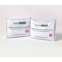 For comfort all year long, this Homescapes Premium White Goose Down All Seasons Duvet offers you a luxury cover for every season. Included in this duvet is one 4.5 Tog duvet as well as one warmer 9 Tog duvet. These duvets can then be attached together to create a warm and cosy 13.5 Tog for the winter. Simple to attach together, simply use the plastic fasteners provided and combine the two duvets via the discrete button holes along the seam. Widely regarded for luxury, comfort and warmth, Goose down has been fine-tuned by nature, and is a long lasting material that is a natural insulator. This duvet gives you a lightweight 4.5 Tog duvet that is suitable to use during the summer to keep you warm all night long without causing you to overheat. The 9 Tog duvet is designed to be used during spring and autumn months, and each duvet has baffle box construction which allows air to flow throughout the duvet, maintaining your body temperature and preventing any cold spots from occurring. Each du... - Manufacturers part numbers: .|Homescapes_5055967478480