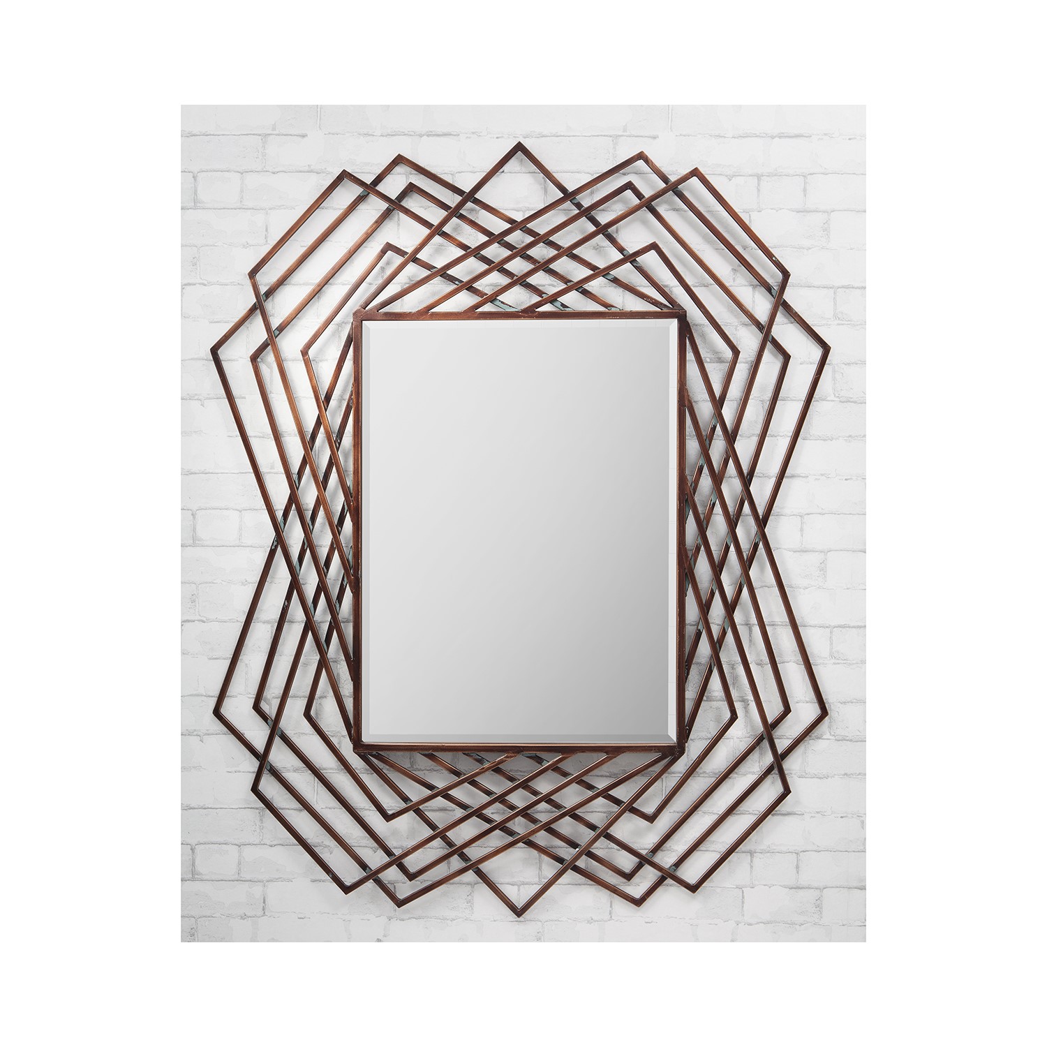 Dimensions W94 cm x H109.5cm . Striking feature mirror with a bold geometric frame in an burnished copper finish . Brushed metal copper frameBest situated in a living room bedroomhallway or bathroomEdgy geometric modern design. .