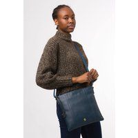 The 'Sol' cross body clutch bag from Conkca London is handcrafted from multi-toned leather for a beautiful finish. A zip-over top opens to reveal the interior with two slip pockets for a smartphone and keys, lined with natural and untreated 100% cotton. Features two full-width pockets on either side of the main compartment, ideal for on-the-go storage. Comes with an adjustable fabric strap with a maximum drop length of 70cm. Adorned with the inimitable Conkca squirrel charm and Conkca logos. | Conkca London Women's 'Sol' Leather Cross Body Clutch Bag in Blue - Manufacturers part number: Conkca London_5056032792173