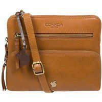 The 'Angel' cross body clutch bag from Conkca London is handcrafted from multi-toned leather for a beautiful finish. A zip-over top opens to reveal a spacious compartment with two slip pockets, lined with natural and untreated 100% cotton. Two zipped pockets on the front of the bag provide on-the-go storage. It comes with an adjustable leather strap with a maximum drop length of 70cm, which is removable, converting the bag into a clutch bag. Adorned with the inimitable Conkca squirrel charm and Conkca logos. | Conkca London Women's 'Angel' Leather Cross Body Clutch Bag in Tan - Manufacturers part number: Conkca London_5056032792418