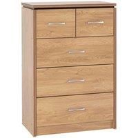The Charles range of bedroom furniture is an attractive set of oak effect furniture that is finished with a stylish walnut trim. With different sizes of bed and wardrobe available it is suitable for any size room.With 3 large and 2 smaller drawers the Charles 5 Drawer Chest in Oak is the essential storage purchase for the cluttered bedroom. As well as this versatility of storage the chest offers a rectangular top which can be used as additional shelf space to bring extra light or colour into your bedroom. The drawers feature metal drawer runners for durability. Finish Oak Effect Veneer with Walnut Trim Sizes W78cm x D44.5cm x H117cm Features . Chest of Drawers5 DrawersMetal Drawer RunnersRectangular TopOak Veneer with Walnut TrimPart of th... - Manufacturers part number: Seconique_