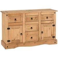 Get offerExuding a natural warmth and Mexican styling the Corona sideboard is a beautiful addition to your home. Offering excellent storage and spacious display space. DIMENSIONS Overall H84 x W132 x D44.5 cm . Small Drawers H12.5 x W29.5 x D32 cm. Large Drawers H15.5 x W29.5 x D32 cm. Door Size H41.5x W32.5 cm . Top Shelf H21 x W40 x D38.5 cm. Bottom Shelf H24.5 x W40 x D38.5 cm FEATURES . Mexican influenceSolid pine construction3 Small top drawers2 Larger middle drawersPine drawer runners2 Cupboards with 1 shelf in eachPlastic roller catches on doorsAdjustable shelves by 6.5cmBlack metal handles and; hingesSpacious surface topCoordinating items available HOW BIG AM I£ The Corona sideboard is a beautiful piece for any room in your h... - Manufacturers part numbers: _|400-405-009