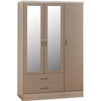 The Nevada 3 Door 2 Drawer Mirrored Wardrobe features a contemporary design owing to the gloss finished front which contrasts perfectly with the light oak veneers. The Nevada has your storage needs covered thanks to the 2 drawers, top shelf and hanging space from the metal rail.Please note, unfortunately we cannot deliver this item to the Channel Islands.[Click here to view the full Nevada range](https://www.dunelm.com/category/home-and-furniture/furniture/shop-by-collection/nevada-furniture-collection) - Manufacturers part numbers: 100-101-078|30606999