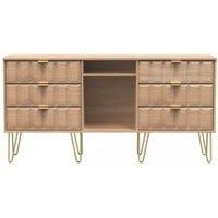 This 3 drawer TV Stand/Sideboard can support TV sets of up to 70" and comes with 6 storage drawers on smooth metal runners with linen effect linings. In addition the unit features a large central storage area and extra fixed storage area. Features a distinctive cube pattern front, gold metal haipin legs, sleek matching metal handles and a scratch resistant finish. All our furniture is manufactured to order in the UK and delivered to your door fully assembled. Features: Fully Assembled UK Manufactured S...