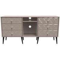 This wide storage unit features 6 storage drawers with a central shelf. Suitable for use as a TV/Media unit or sideboard. A modern and distinctive range. Named for the unique "Pixel" patten of the drawer and door fronts. Also features Black Metal Handles and Black Hairpin Legs. Comes in a wide range of colours including eye cathching two tone colour combinations. All our furniture is made in the United Kingdom, to the highest quality. It is delivered direct to your location of choice by one of our two...