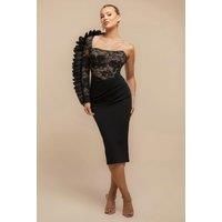 Sculpt your figure with the Goddiva One Shoulder Organza Fan Detail Lace Bodice Midi Dress in Black, a blend of modern elegance and sultry charm. Featuring a striking one-shoulder design and long sleeve, the dress boasts an organza fan pleat detail for a touch of drama. The lace bodice adds a romantic, intricate texture, while the scuba foam skirt offers a bodycon fit for a flattering, sleek silhouette. Perfect for weddings, special occasions, or any chic evening event, this black dress exudes luxury at an affordable price. - Manufacturers part number: Goddiva_