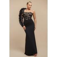 One Shoulder Organza Fan Detail Lace Bodice Maxi Dress