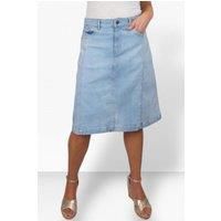 Denim is back this season, create your look with our A Line denim skirt. Made from a soft stretch denim material with multiple panels creating a flared style. The soft denim perfectly helps sculpt around various body shapes creating comfort all day and a desired silhouette. There is a classic 5 pocket design, with 3 on the front with dark colour rivets and 2 plain pockets on the back for your essentials. With multiple belt loops around the waistband, you can accessorise with your favourite belt. Simple fasten with a single dark silver coloured button and a zip fly. With a front length of 23-24" (59-61cms) this rests around knee length. Our model is 5'7" and wearing a size 12. | Paulo Due Women's Panelled Denim A Line Skirt in Light Blue | Size: 22 - Manufacturers part number: Paulo Due_5056144969135