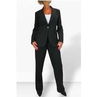 This elegant 2-piece womens trouser suit is made from a soft stretch suiting fabric (75% Polyester, 20% Viscose, 5% Spandex; lining: 100% Polyester) and is fully machine washable. The jacket features a fully lined interior with structured shoulder pads, a single large marble-effect button, flapped slit pockets (easily opened by removing the tacking stitches), a decorative top pocket, and refined sleeve slit detail with matching buttons. The matching trousers have a high waist and a wide straight-leg cut...