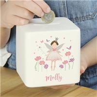 * Personalised with your chosen name* Fairy princess design with soft colours* Made from ceramic* Slot at the top for coins and notes Make saving fun with this personalised ceramic money box, featuring a sweet fairy princess design and your chosen name. Whether its for a birthday, christening or baby shower, its a keepsake that adds a magical touch to any nursery or playroom. The slot at the top makes it easy for little ones to pop in coins and notes. Made from ceramic, its sturdy enough to last through... - Manufacturers part number: 31022972
