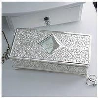 Personalsied Antique Jewellery Box This Personalised Swirl & Hearts Antique Silver Plated Jewellery Box is the perfect size to hold her sentimental and precious jewellery. Personalise this traditionally styled decorative Antique Jewellery Box with your own special message to create a unique gift. The lid is hinged and the interior is lined in a blue flock fabric with a separate section to proudly hold her rings. Depth: 16.5 MM Height: 8.7 MM Width: 8.19 MM Personalise with a message of up to 60 characte...