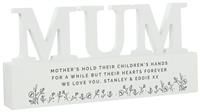 This personalised floral wooden MUM ornament is perfect for any occasion This wooden ornament can be personalised with 3 lines of text as below. Message line 1 - 45 characters, message line 2 - 45 characters, message line 3 - 35 characters. The personalisation will appear in fixed uppercase. Please note that this is a wooden handmade item so there may be slight imperfections. Ideal for mothers day, birthday, memorial. A hand made personalised wooden MUM ornament is perfect for any occasion A free standi... - Manufacturers part number: 30878118