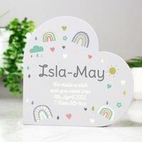 * Personalised Rainbow Free Standing Heart Ornament* Personalize with up to 5 lines:* Line 1 (larger text): Up to 12 characters (avoid fixed uppercase)* Lines 2-5: Up to 30 characters each* Note: Product is made from natural wood and may contain some imperfections. The Personalised Rainbow Free Standing Heart Ornament is a delightful addition to any child's bedroom, and you can make it even more special by personalising it with up to five lines of text.**How to personalise your product:**1. Place your ... - Manufacturers part number: 30878130