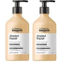 Stock up and save with L'Oreal Professionnel Serie Expert Absolut Repair Conditioner supersize double pack. The L'Oreal Profesionnel Serie Expert Absolut Repair is an instant resurfacing conditioner for very damaged hair. This professional formula is infused with Gold Quinoa Bran extract and Wheat Protein. Combines intense resurfacing with a lightweight and soft touch, treats and detangles without weighing the hair down. Hair surface is instantly transformed with resistance, softness and shine. | L'Oreal Professionnel Serie Expert Absolut Repair Conditioner 500ml Supersize Double in Clear - Manufacturers part number: L'Oreal Professionnel_5056182310609
