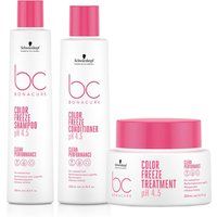This great value pack from Schwarzkopf BC Clean contains all you need to maintain coloured hair with a gorgeous healthy shine! Contents: 1 x Schwarzkopf BC Clean Color Freeze Shampoo 250ml 1 x Schwarzkopf BC Clean Color Freeze Conditioner 200ml 1 x Schwarzkopf BC Clean Color Freeze Treatment 200ml All products work together to freeze colour pigments in place onside the hair matrix so that fading is prevented. A gently formulated shampoo ideal for colour-treated hair. Restored to its optimal pH level, hair is left looking and feeling amazing. The conditioner enables detangling and helps to smooth each strand for gorgeous shiny hair. The treatment provides in-depth care to intensively repair damaged hair. Vegan formula*. Free from SLS/SLES sulphates**, silicones and artificial colourants. Ingredients: Shampoo: Aqua (Water, Eau)*Cocamidopropyl Betaine*Sodium Methyl Cocoyl Taurate*Coco-Glucoside*Sodium Chloride*Sodium Methyl 2-Sulfolaurate*PEG-120 Methyl Glucose Dioleate*Magnesium Citrate*... - Manufacturers part number: Schwarzkopf_5056182318902