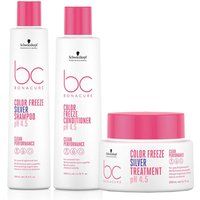 Stock up and save on your Schwarzkopf BC Clean favourites with this great-value pack, containing: 1 x Schwarzkopf BC Clean Color Freeze Silver Shampoo 250ml 1 x Schwarzkopf BC Clean Color Freeze Conditioner 200ml 1 x Schwarzkopf BC Clean Color Freeze Silver Treatment 200ml These products are specially formulated for porous, colour-treated hair, specifically grey and lightened hair. Hair is restored to its optimal ph level of 4.5 preventing fading for long lasting hair colour. Any unwanted warm undertones will be neutralised. The shampoo gently but effectively cleanses coloured hair. Secondly, the conditioner enables easier detangling and helps to smooth each strand for gorgeous shiny hair. Lastly, Schwarzkopf BC Clean Color Freeze Silver Treatment provides in-depth care for up to 95% less hair breakage. This silver treatment adds a cendr shimmer to white hair and very light bases. Vegan formula*. Free from SLS/SLES sulphates**, silicones and artificial colourants. Ingredients: Shampoo:... - Manufacturers part number: Schwarzkopf_5056182318926