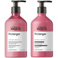 This duo includes shampoo and conditioner with FILLER-A100 and amino acids to strengthen and renew long hair, reducing breakage and enhancing shine for healthier-looking lengths. | L'Oreal Professionnel Pro Longer Shampoo Conditioner Duo in Pink - Manufacturers part number: L'Oreal Professionnel_5056182330621