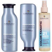 Say goodbye to brassy blonde with this repairing and luxurious shampoo, conditioner, and multi-tasking spray. Carefully formulated, the gentle and creamy toning Strength Cure Blonde Shampoo works to effectively repair the strength of damage colour-treated hair while neutralising unwanted warmer tones in lightened hair. Boasting super-nourishing ingredients, the Strength Cure Blonde Conditioner helps repair the strength of damaged strands, promoting resilience and restoring shine. The Pureology Color Fanatic Multi-Tasking Spray helps to detangle, prime, protect, and add shine to your colour treated hair | Pureology Strength Cure Blonde Shampoo, Conditioner & Color Fanatic Multi-Tasking Spray 200ml Pack in Clear - Manufacturers part number: Pureology_5056182332687