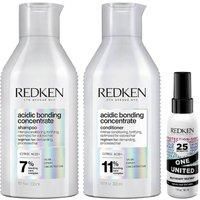 Restore strength and nourishment to damaged hair with this Redken Acidic Bonding Concentrate Pack. Experience total hair transformation with this powerhouse pack including a full size shampoo and conditioner with a deluxe travel size One United Treatment. | Redken Acidic Bonding Concentrate & One United Bundle in Clear - Manufacturers part numbers: Redken_5056182333844|R00015