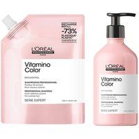 Trusted by hair stylists. Adored by you. L'Oreal Professionnel are renowned for bringing salon grade products into your home. Stock up and save on your favourite Shampoo with this L'Oreal Professonnel Vitamino Color Shampoo 500ml & Refill Pack 500ml Duo! L'Oreal Professionnel Serie Expert Vitamino Color Shampoo protects your hair colour from fading for up to 8 weeks. This shampoo gently removes impurities leaving your hair soft and protected. What are the results£ Up to 6 times more shiny, resulting in brighter colour, more radiance and glossy hair! | L'Oreal Professionnel Vitamino Color Shampoo & Refill Pack 500ml Duo in Clear - Manufacturers part number: L'Oreal Professionnel_5056182335664