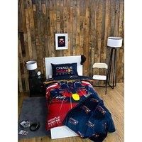 F1 Red Bull Single Panel Duvet Live out your dreams of being a champion Formula 1 racing driver with this officially licensed Red Bull Racing bedding set. The set includes a single duvet cover and pillowcase, and is reversable so you can freshen up the look of your childs room. The front side of the reversable duvet cover features a large print of Max Verstappens F1 Championship winning racing car, tearing down a red straightaway with a bright yellow sun in the background, the main side of the pillowcas...