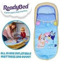 BLUEY BEDTIME MY FIRST READY BED Depth: 12 CM Height: 28 CM Width: 40 CM Age Range: 18 months+ Warning Message: Warning: This toy does not provide protection Unique 2 in 1 airbed and sleeping bag Pump and carry bag included Machine washable cover Supported headrest Ideal for camping beds or sleepovers
