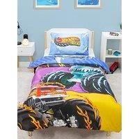Hot Wheels Hot Wheels Monster Panel Duvet- Single Time to burn some rubber! Perfect for all young racing fans, this officially licensed Hot Wheels bedding is brilliant for brightening up a bedroom. The duvet cover and pillowcase set is made for single beds and features a reversible pattern for when you want to freshen up the look of your childs room. On the front side of the duvet cover theres a large print of 3 monster trucks with themed backgrounds including a dinosaur and fire engine theme. The match...