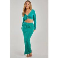 This figure-flattering co-ord is this season's wardrobe essential. Pair with our Shimmer Ruched Ring Detail Top for an easy insta-worthy 'fit. With ruched detail, this set will keep all eyes on you. | Pink Vanilla Women's Shimmer Maxi Skirt in Jade | Size: Medium - Manufacturers part number: Pink Vanilla_5056309996020