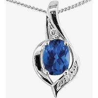 A beautiful pendant focusing around a 6x4mm oval-cut sapphire, with a swirling frame of 9ct white gold studded with two diamonds.