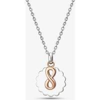 A lovely sterling silver pendant crafted with a plain flower shaped disc accompanied with a rose gold plated infinity symbol. The ideal gift for that special someone.