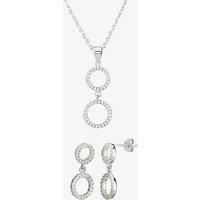 This classic jewellery set combines an open circle design with articulated movement to produce the double halo droppers of the matching pendant and earrings, perfect for adding a subtle shimmer to any outfit - Pav-set Cubic Zirconia - Sterling Silver - Pendant Measuring 22x10mm at the widest point, with a 6mm bale - Droppers measuring 9x19mm at the widest points - Necklace Length: 18 inches / 45.72 cm