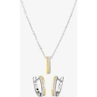 Add a touch of glamour to your outfit with these beautiful matching earrings and pendant. The focal point of each piece is the mirror image of polished gold plate against the high shimmer of the row of sparkling stones, the surfaces of which curve gently to catch the light. The pendant has a hidden bale which is threaded onto a petite trace chain, whilst the earrings fasten via a hinged leverback system for ease of use. - Pav-set White Cubic Zirconia - Sterling Silver with Gold-plating - Pendant measuri...