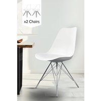 This set of two Eiffel inspired Plastic Dining Chairs with Chrome Metal Legs are part of a collection of dining chairs which are designed to be both stylish and comfortable. The moulded plastic seat with removable padded cushion is easy to clean and makes for a pleasant seating experience. The contoured seat and Eiffel inspired Chrome metal legs not only look great, but are the reason this chair is so sturdy. Our Soho range is available in a wide range of colours and a choice of bases, making it super easy to create the perfect chair for you or your business. Whether its used for long leisurely meals at the dining table or for time spent reading at a desk, these chairs looks fantastic both at home and in commercial settings hard wearing too, to stand the test of time! | Fusion Living Set of 2 Soho Plastic Dining Chairs with Chrome Metal Legs in White - Manufacturers part number: Fusion Living_5056409316872