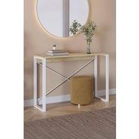 Introducing the FWStyle Natural Oak White Metal Frame Console Table, a stylish and functional addition to your entryway or living space. This elegant table is made from the highest quality engineered wood, ensuring durability and longevity. The beautiful natural oak top is complemented by a sleek white metal frame, creating a modern aesthetic that fits seamlessly into any decor. Designed for convenience, this console table is delivered flat packed for fast and hassle-free assembly. It comes in strong outer packaging, reflecting a commitment to sustainability. The strong melamine scratch-resistant coating adds an extra layer of protection, ensuring your table maintains its pristine appearance over time. Additionally, the added cross support back beams enhance stability, making this console table both stylish and sturdy. Elevate your home with the FWStyle Natural Oak White Metal Frame Console Table today! | FWStyle Console Table Modern Natural Oak Design Metal Frame Cross Supports in Whi... - Manufacturers part numbers: M.V2.K.24321.3|FWStyle_5056413125095