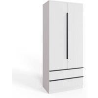 Introducing the FWStyle 2 Door 2 Drawer Lania Combination Wardrobe, a stunning fusion of modern aesthetics and practical storage solutions. This wardrobe features a unique Scalloped Ripple Effect design on the door and drawer fronts, adding a contemporary flair that enhances any bedroom decor. The sleek black metal slim bar handles complement the design, providing a stylish yet functional touch. Equipped with two spacious 10cm drawers, this wardrobe offers additional storage for your clothing and accessories, ensuring everything has its place. The two large doors reveal a generous internal storage compartment, complete with a full-width integral hanging rail, perfect for organizing your garments with ease. Delivered flat-packed for convenient home delivery, the FWStyle Lania Combination Wardrobe also includes a 1-year guarantee, giving you peace of mind with your purchase. Elevate your bedroom storage with this modern and elegant wardrobe, designed to meet all your organizational needs... - Manufacturers part number: FWStyle_5056413127976