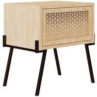 Introducing the Naive push-to-open bedside table in oak, combining functionality with modern elegance. This stylish unit features a minimalist design, highlighted by its sleek oak finish and eye-catching laser-cut design that adds texture and visual appeal, creating a touch of sophistication to any bedroom. The push-to-open mechanism ensures easy access to the spacious storage compartment, perfect for stashing away night time essentials or personal items. Supported by sturdy black metal legs, this bedside table not only offers stability but also creates a stunning contrast that enhances its contemporary appeal. Whether decorated with a plant, alarm clock or your favourite bedtime reads, this bedside table is the perfect blend of style and practicality, making it an ideal addition to your space. | FWStyle Oak Effect 1 Door Bedside Chest Push To Open in Brown - Manufacturers part numbers: M.V2.KO.23231.3|FWStyle_5056413131508