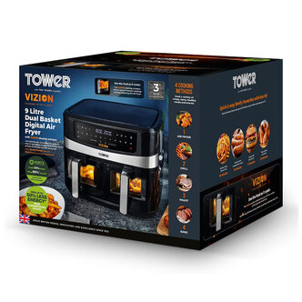 Free 3 Year Warranty by RedemptionPowerful 2600W Dual Basket Air Fryer9 Litre Total CapacityDual 4.5L Baskets with Viewing Windows10 Cooking Functions Including DehydrateMatch Cook Sets Settings on Both BasketsRapid Air Circulation Cooking TechnologyDigital Touch Screen Display60 Minute TimerTemperature 50 to 200 DegreesLittle Or No Oil RequiredOverheating ProtectionNon Slip FeetColour: BlackH321 x W385 x D355 mm - Manufacturers part number: T17100