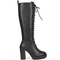 Take your Boot collection to another level in eye catching Knee High Boots! Featuring a platform sole, a block heel and lace up fastening. Ideal For Casual, Winter, Fashion, Work, Festival & More. Get new season ready with these boots, team with an white shirt dress and a tailored blazer. | XY London Women's 'Ruthie' Knee High Block Heel Lace Up Platform Boots in Black | Size: 6