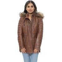This slim fit parka jacket is a great choice to pick up for colder weather, featuring a detachable fur line hood which not only keeps you warm but provides an exuberant look to this piece. The jacket front is furnished with four zip pockets which are tabbed for easy opening, additional quilted detailing can also be found on the jacket sleeves and waist for a lux design that punctuates the smooth aesthetic provided by our premium nappa finish. A high collar that can be fastened with press studs rounds off this jacket which makes for a great chic addition to your winter wardrobe. 100% premium ultra-soft nappa leather Features detachable fur hood, four zipped pockets and zipped cuffs High stand collar with quilted detailing on the jacket waist and sleeves | Infinity Leather Women's Quilted Leather Parka Jacket-Curitiba in Tan | Size: 24 - Manufacturers part number: Infinity Leather_5056486341781
