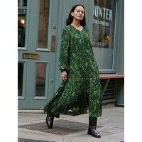 Albaray Paisley Dress Our voluminous maxi dress provides both comfort and style. Featuring a gathered round tie neck with blouson long sleeves with soft pleats at the shoulder. This dress has a tiered hem and a tie belt to accentuate your waist. Material Content: 100% Viscose