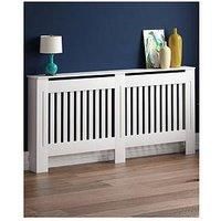 Vida Designs Chelsea Extra Large Radiator Cover in White - 162 cm wide (internal) This extra large radiator cover by Vida Designs not only keeps a radiator smartly covered for a more attractive look in your room, it also offers valuable shelving space. Measuring 162 cm internally (172 cm externally), the modern design is finished in a fresh white shade, while a smart vertical ventilation pattern looks good and ensures you won't lose any of the heat coming from your radiator. The top shelf can be used ...