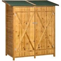 Reclaim garden space with this tall and narrow vertical storage shed from Outsunny.This tool cabinet is covered with a coat of protective paint, which helps protect the structure from light weather damage.A sloped roof prevents water build-up, with asphalt covering so liquid doesn't seep through.It's finished with a lockable door making it secure.Equipped with a movable storage table for convenience.L-shaped fixed fittings and ground nails can fix it on the ground, making it more stable.. This garden storage is ideal for storing garden equipment and garden accessories. Equipped with a movable double-layer table. With L-shaped fixed fittings and ground nails to fix the tool shed on the ground. 3 partitions and hooks to house tools. Comes with two barrel bolts to lock the door . Use waterproof asphalt roof. Double door for easy access. Assembly Required. Colour: Natural . Material: Wood . Overall Dimension: 140L x 75D x 160H cm . Floor Space: 0.81 m2. Eaves Size: 121W x 67D cm. Single Do...