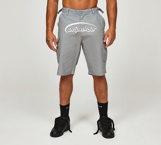 Dripmade Ambush Cargo Shorts in Grey and White. Your wardrobe is Ambushed by Dripmade who kindly leave it these robust cargo shorts to accompany you on your next urban adventure. With a button top fastening, adjustable waist strap, handy belt loops, open side pockets, back pocket, and multiple flap fastening cargo pockets that supply a series of safe storage points for your small belongings. Large Dripmade branding across front, and smaller contrast box brandings to front and back pockets. Regular fit. ...