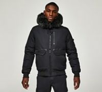 Zavetti Canada Albertini Bomber Parka Jacket in Jet Black. Padded winter prowess with a sustainable recycled lining makes for a great winter deterrent. With a full zip fastening front, adjustable drawstring hood, fluffy removable faux fur hood trim, classic bomber jacket ribbed cuffs and hem, an array of secure zip fastening, flap pockets and discreet internal pocket giving you plenty of options for your small essentials, utility loops and embroidered Zavetti Canada logo patch to left sleeve and inner p...