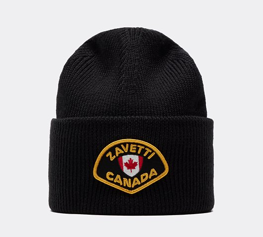 Zavetti Canada Alberta Knitted Beanie in Jet Black. The thick, cosy stretchy ribbed part-wool construction allows for a snug cosy fit when you need it most. Hugging onto your head whenever the cold kicks in, the turn-up cuff presents a contrast embroidered Zavetti Canada shield badge to the front. One size fits all. Black Size - ONE SIZE