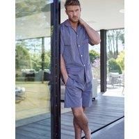 Keep your cool with this warm-weather pyjama set. Crafted from a smooth and breathable cotton, it's just the ticket for when you're travelling somewhere exotic, or simply relaxing at home in the summer months. Offered in a timelessly stylish design, the shirt is finished with elegant contrast-colour piping and three pockets, while the shorts feature a soft elastic waist with a self-fabric tie. | British Boxers Men "Winchester" Stripe Crisp Cotton Short Pyjama Set in Mid Blue | Size: large